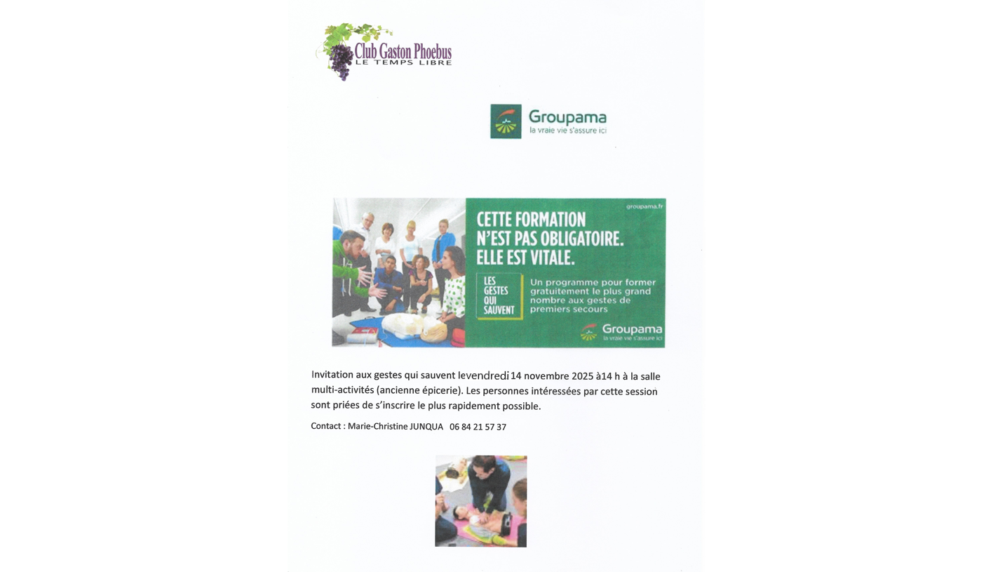 Nouveautés : Formation les Gestes qui sauvent, avec le concours de GROUPAMA et Les Sapeurs Pompiers, le vendredi 14 novembre à 14h - ICI INVITATION